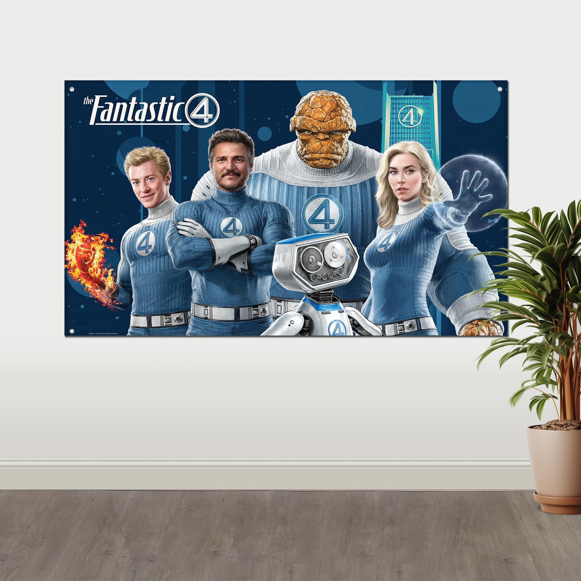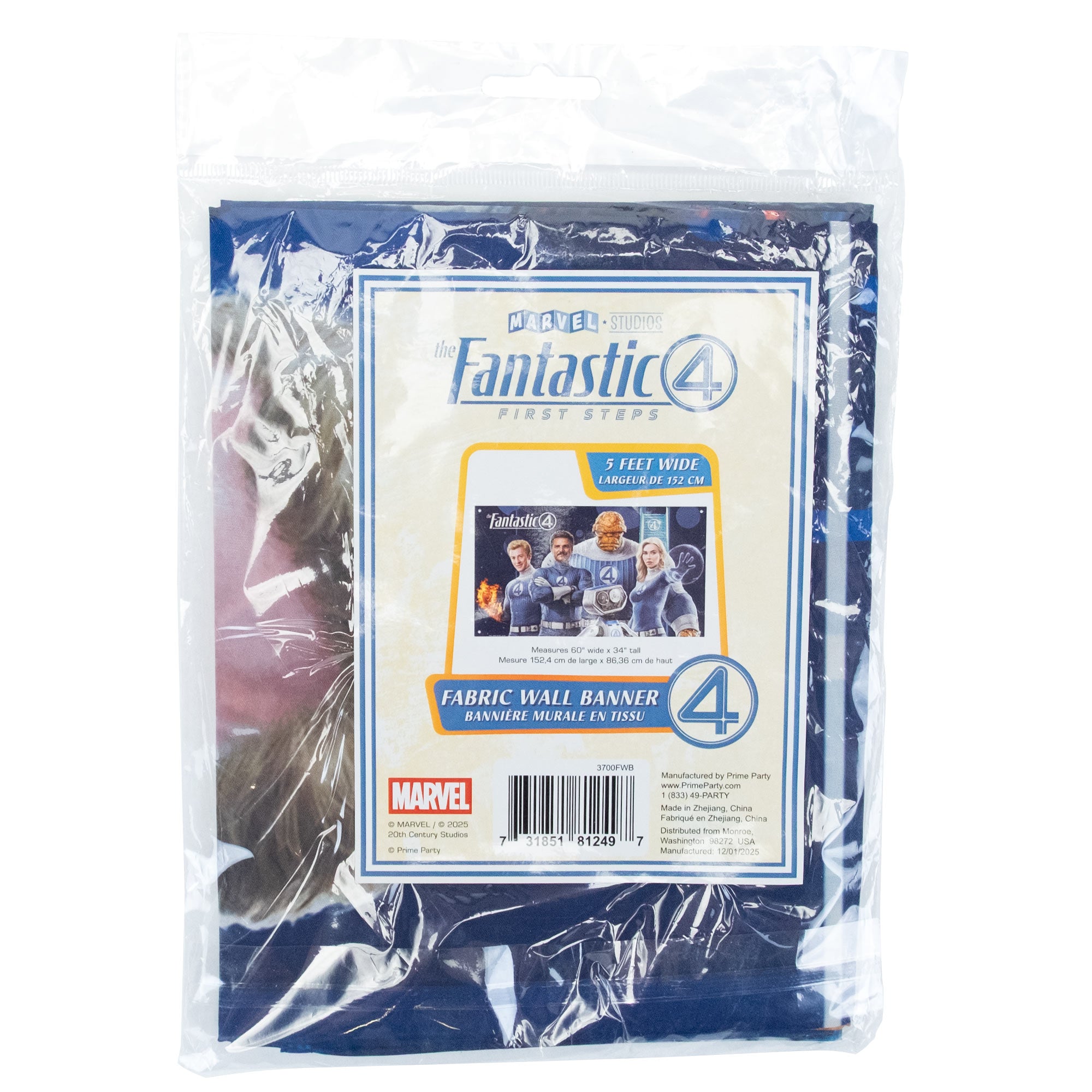 Fantastic 4 Fabric Wall Banner (3' x 5'). This large 35" x 60" banner is made from lightweight polyester that hangs smoothly, creating a bold backdrop. It is reusable for parties, photos, or décor.