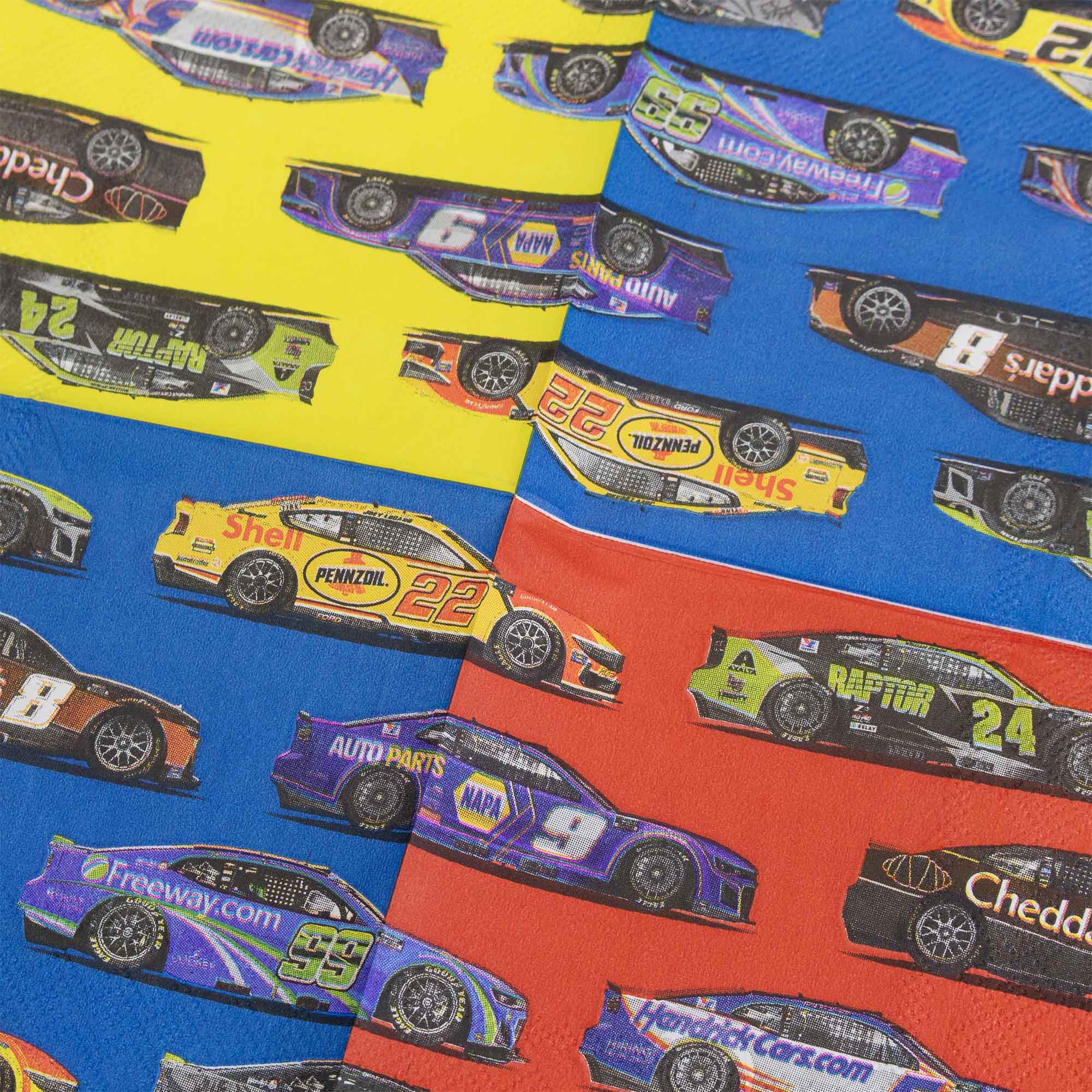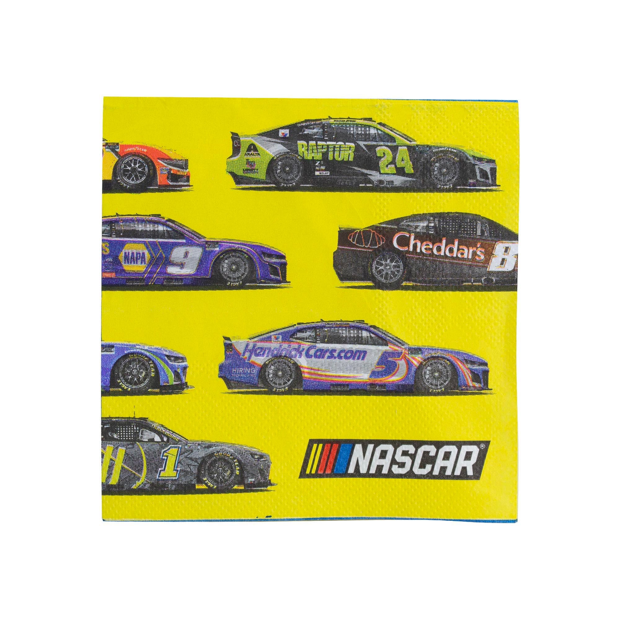 Enhance your NASCAR-themed gathering with our beverage napkins featuring the cars of beloved drivers such as William Byron (Raptor Car), Chase Elliott (Napa Car), Kyle Larson (Hendrick's Car), Kyle Busch (Cheddar's Car), Ross Chastain (Trackhouse Car), Ryan Blaney (Menards Car), Joey Logano (Pennzoil Car), and Daniel Suarez (Freeway Insurance Car). Designed with vibrant NASCAR imagery and crafted from durable 3-ply paper, these napkins measure 5" x 5" when folded. They ensure both style and functionality, perfect for keeping drinks and snacks clean while showcasing your racing spirit.