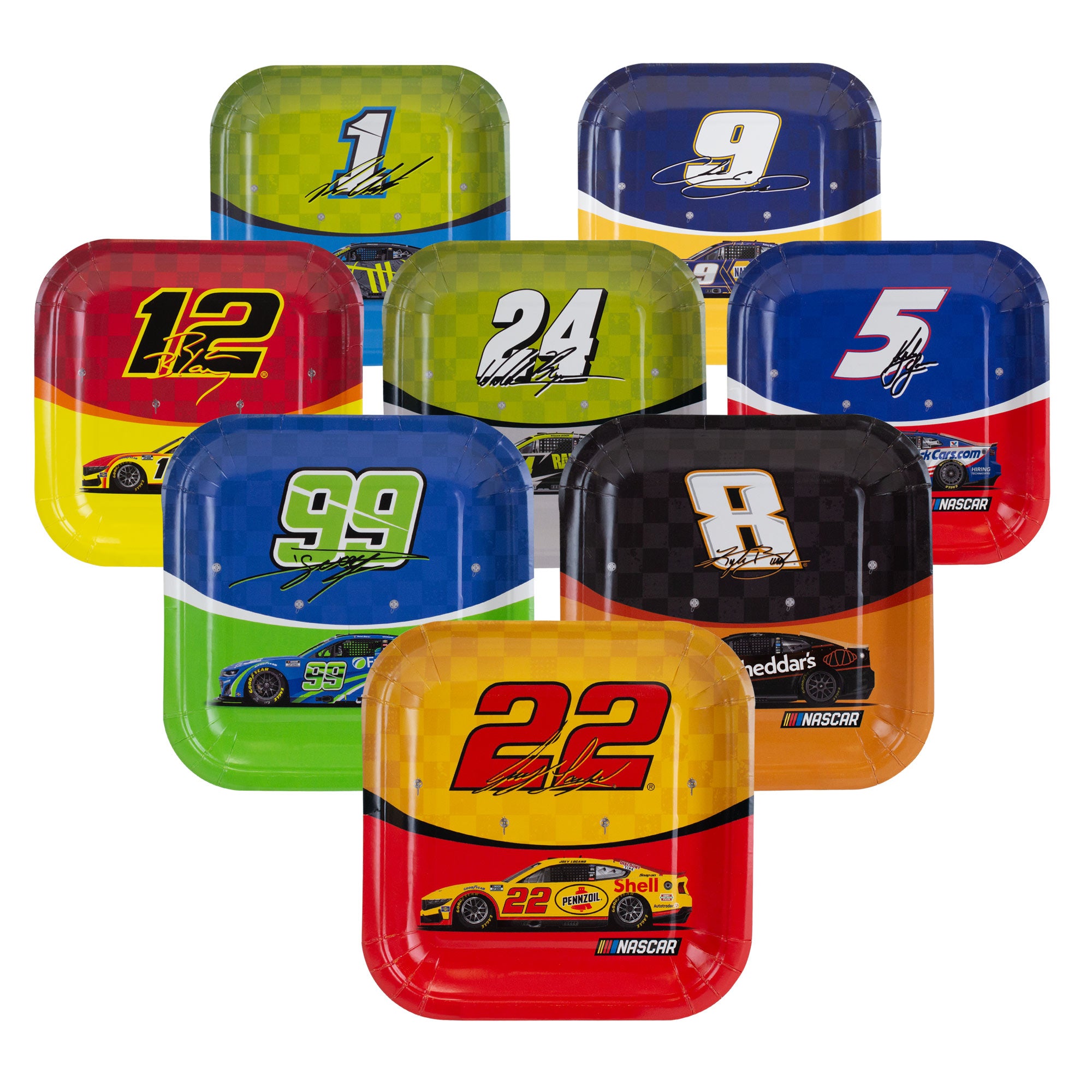 Bring the excitement of race day to your celebration with this officially licensed NASCAR Deluxe Party Pack. Designed for fans of fast cars and top drivers, this all-in-one kit includes everything needed for a high-energy birthday or viewing-party setup. The 9" dinner plates each feature a different NASCAR driver and their signature car, and the matching 7" dessert plates also highlight a unique car-and-driver combo on every plate. Coordinating favor boxes are shaped like race cars, with each box showcasing a different vehicle for added fun and variety.