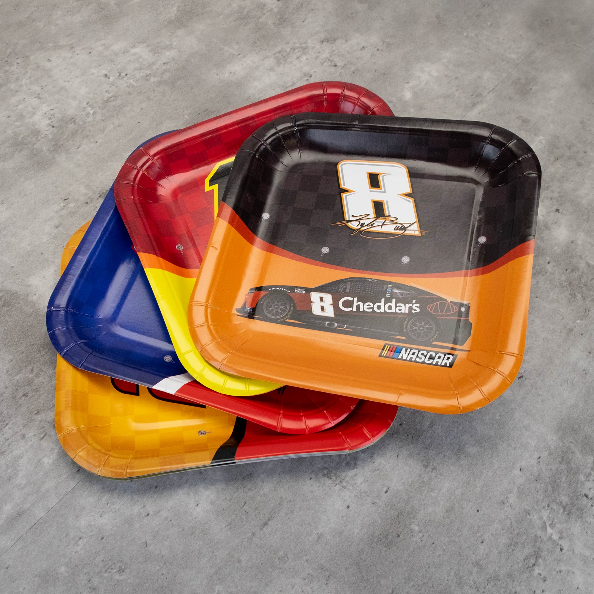 Celebrate NASCAR in style with our 7" paper plates, adorned with the cars of top drivers like William Byron (Raptor Car), Chase Elliott (Napa Car), Kyle Larson (Hendrick's Car), Kyle Busch (Cheddar's Car), Ross Chastain (Trackhouse Car), Ryan Blaney (Menards Car), Joey Logano (Pennzoil Car), and Daniel Suarez (Freeway Insurance Car). Featuring a sturdy cardstock build and colorful NASCAR designs, these plates are ideal for serving desserts or appetizers at your racing-themed event. Add a touch of speed and excitement to your table setting with every plate.