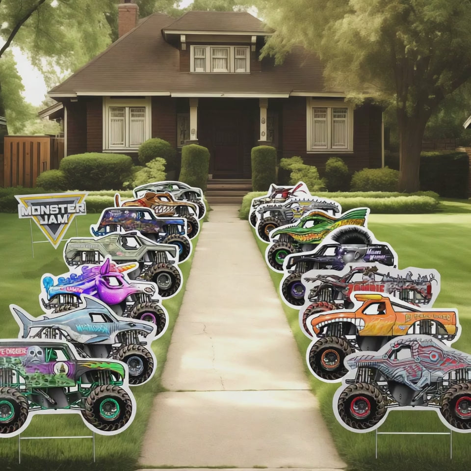 Rev up the excitement at your next party with our Monster Jam-Themed Mega Yard Kit! This ultimate outdoor decoration set features 14 high-quality Monster Truck signs, each measuring 20.5" wide by 12.5" tall, and a Monster Jam Logo sign. Perfect for fans of all ages, this kit brings the thrill of Monster Jam to your front yard or any party venue. The included Monster Trucks are Alien Invasion, Captain's Curse, Dragon, El Toro Loco, Grave Digger, Great Clips Mohawk Warrior, Maximum Destruction, Megalodon, Monster Jam Logo, Monster Mutt, Pirate's Curse, Soldier Fortune, Son-Uva Digger, Sparkle Smash, ThunderROARus, and Zombie.
