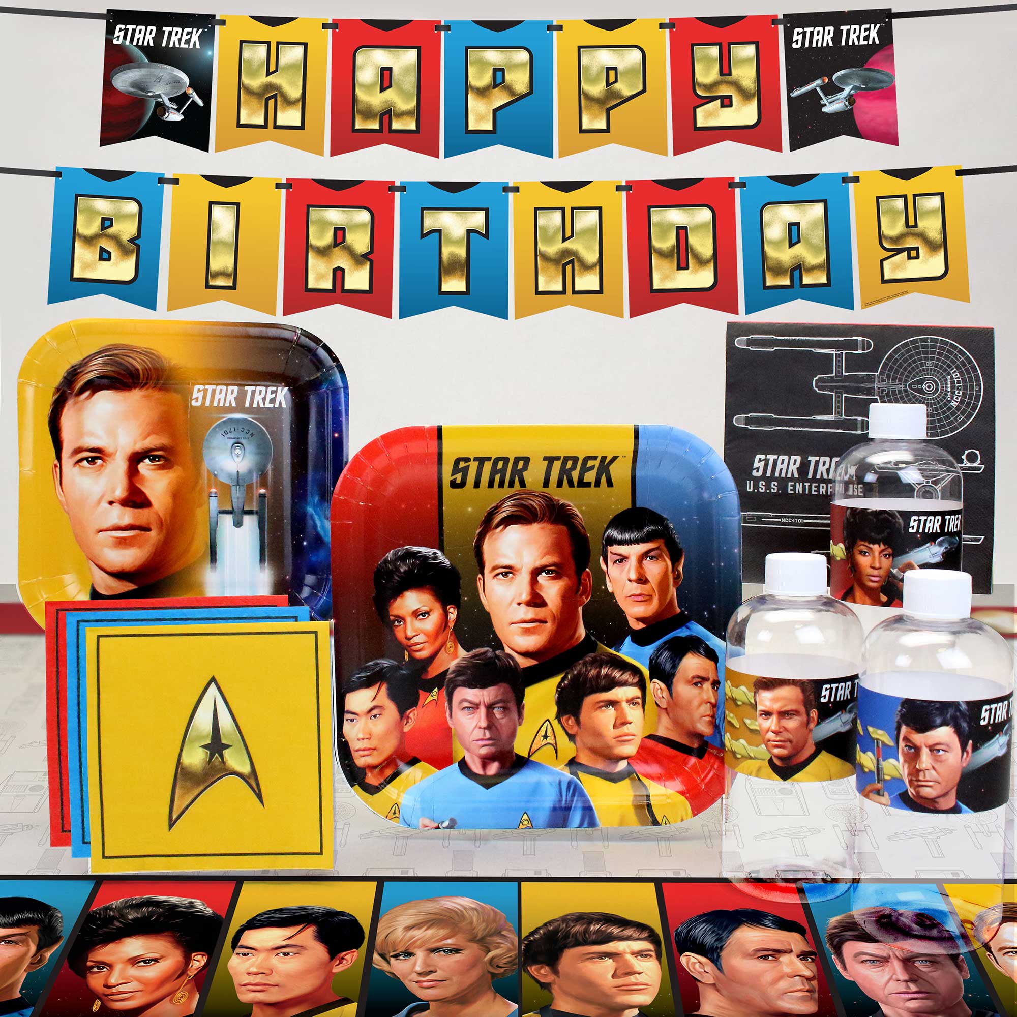The Star Trek Party Standard Pack brings an out-of-this-world celebration to life for fans of all ages. This complete kit includes 9" dinner plates featuring Captain Kirk, 7" dessert plates each with a different character from the crew, lunch napkins, beverage napkins, and custom bottle labels to tie the table together. A themed table cover and a colorful jointed “Happy Birthday” banner add the finishing touch, making it easy to transform any gathering into a Star Trek adventure worthy of the USS Enterprise.