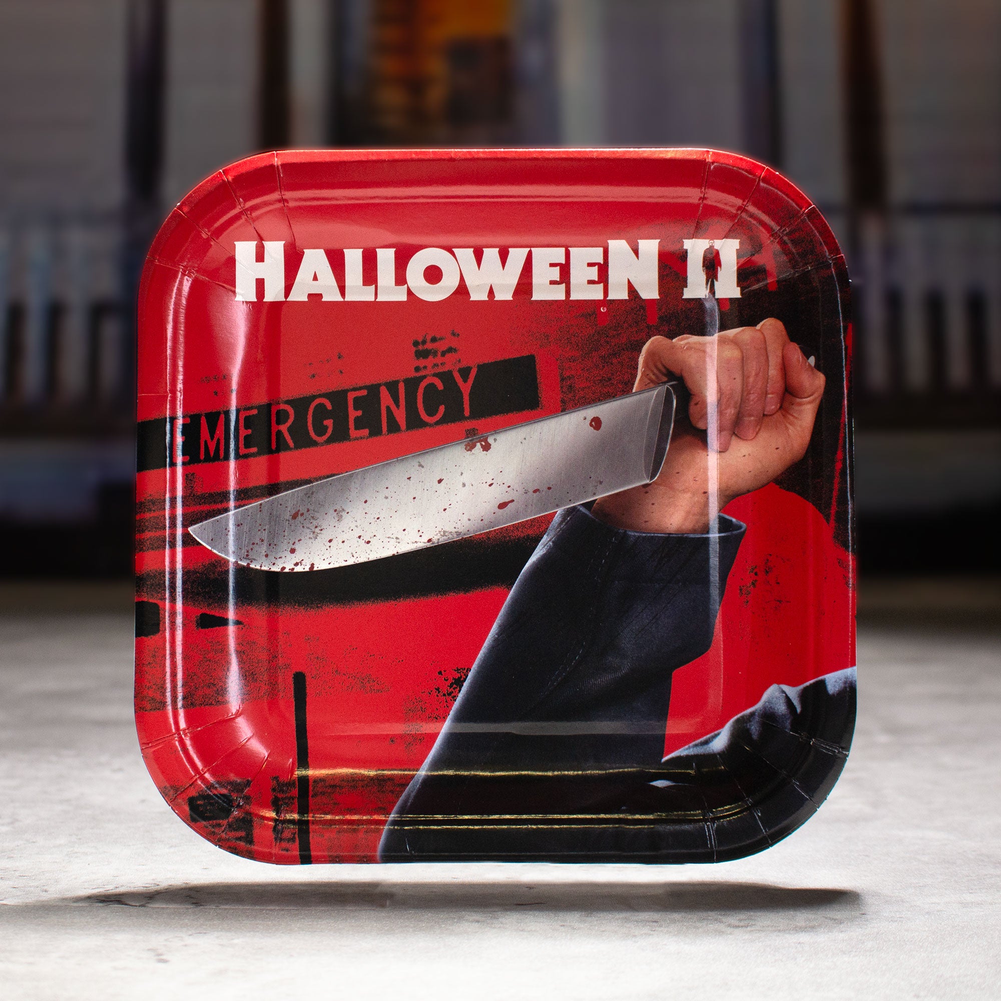 Serve up some fright with these officially licensed Halloween II dessert plates. Featuring Michael Myers’ bloody knife against a bold red backdrop, these plates bring instant horror-movie vibes to your party table. Each plate measures 7" x 7", the perfect size for cake, snacks, and other sweet treats. Made of sturdy paper for durability and easy cleanup. Sold in a pack of 8.