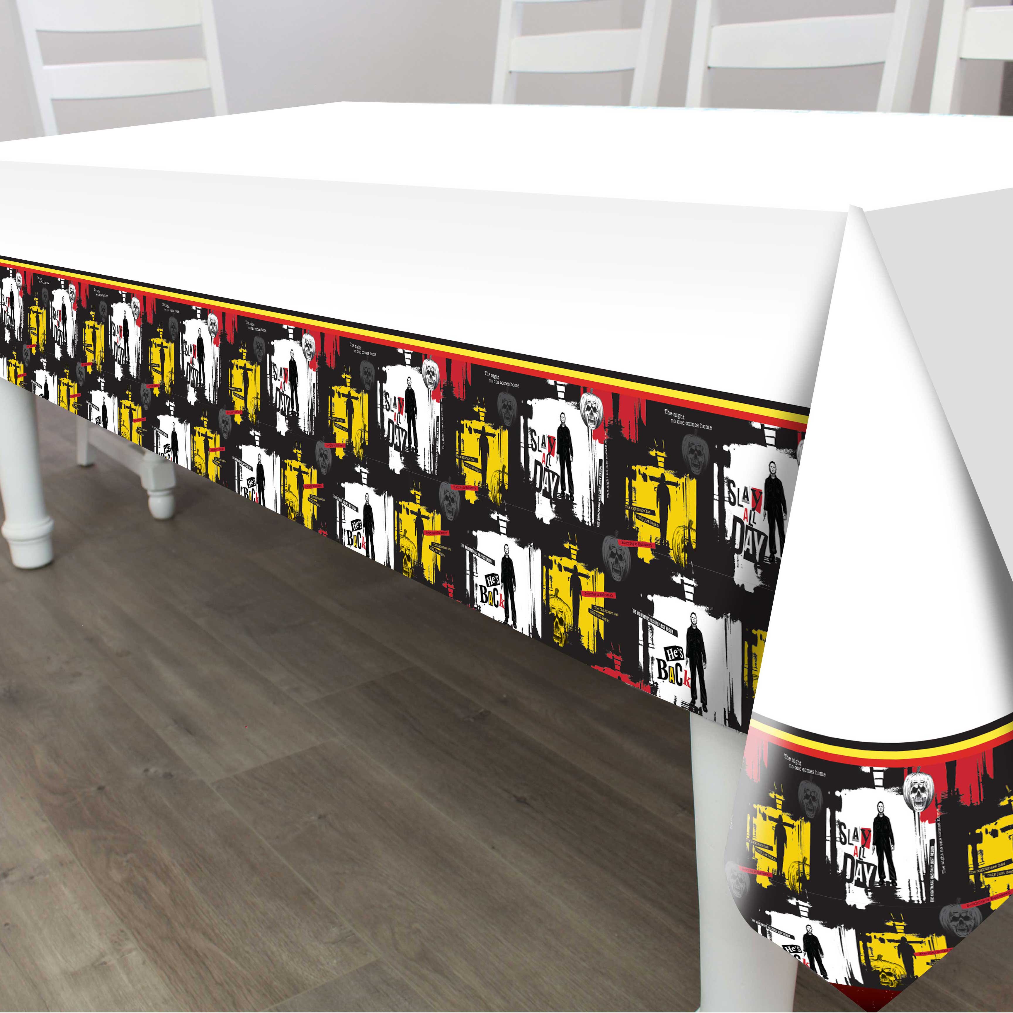 Set a chilling scene at your party with this officially licensed Halloween II table cover. Featuring bold artwork of Michael Myers with a distressed, blood-red design, it’s the perfect backdrop for your horror-themed celebration. Made of durable plastic, this table cover measures 54" x 108"—fitting most standard tables. Disposable and easy to wipe clean, it keeps your party setup both spooky and simple to manage.